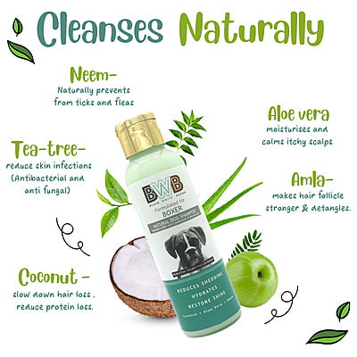 - BWB Shampoo is Paraben Free / SIlicon Free / Alchohol Free. It has natural ingredients like Amla- for Stronger Follicle, Alo Ver a- for healthier Skin Coat, Coconut - for Smooth and Shiny Hairs, Neem- for Anti -Tick & Flea along with Anti Fungal and Anti Bacterial properties.